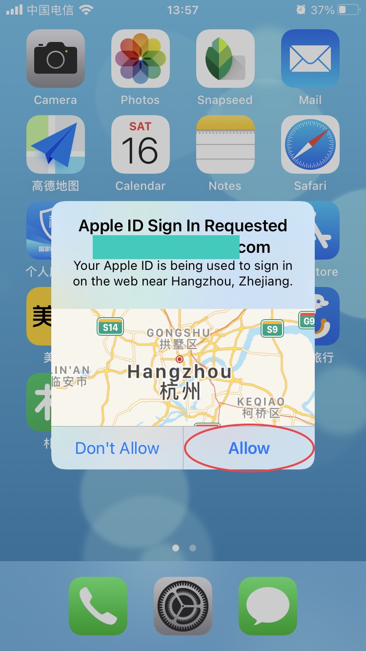 iPhone手机端或Mac电脑端会弹出如下的对话框,确认并将弹出的验证码填入上图网页验证码位置处。