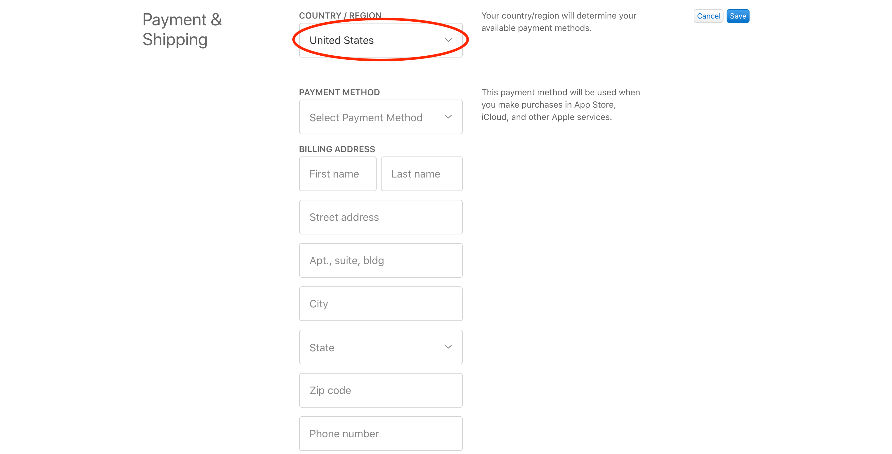 点击右侧的 “Edit” 开始编辑,点击 COUNTRY/REGION 下拉菜单选择“United States”